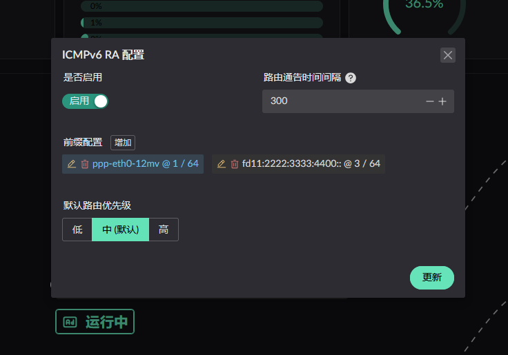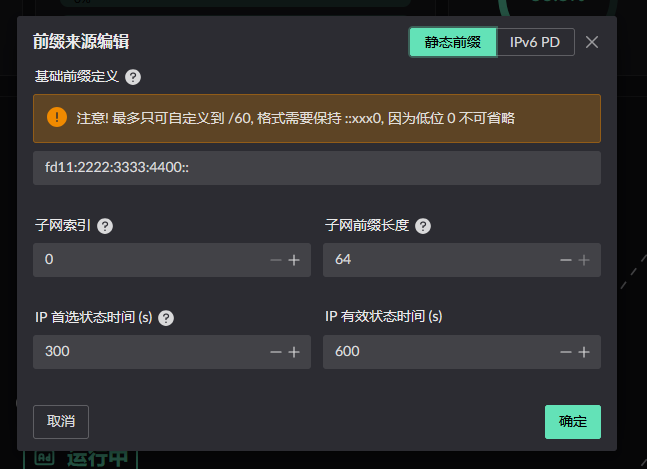 通告的前缀有以下两种来源: 静态 / 动态 PD 获取, 点击前缀配置后的添加, 将会弹出添加界面