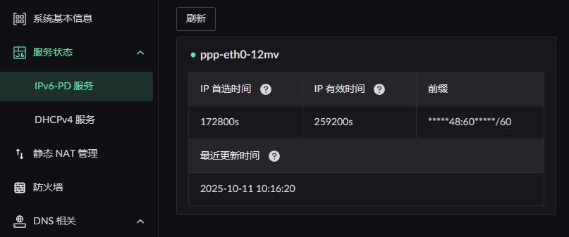如正常获取到前缀, 可在侧边栏: "服务状态" -> "IPv6-PD 服务" 中查看分配到的前缀信息: