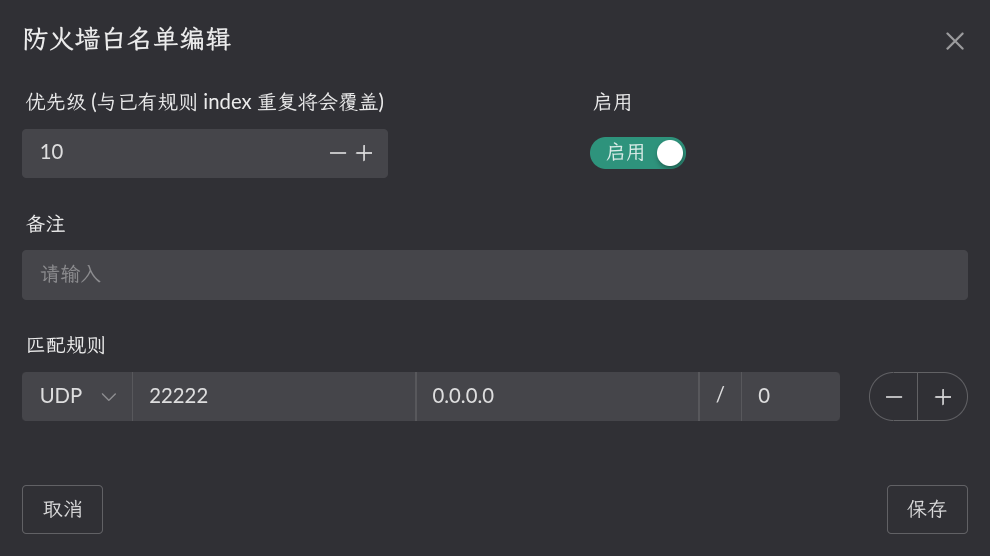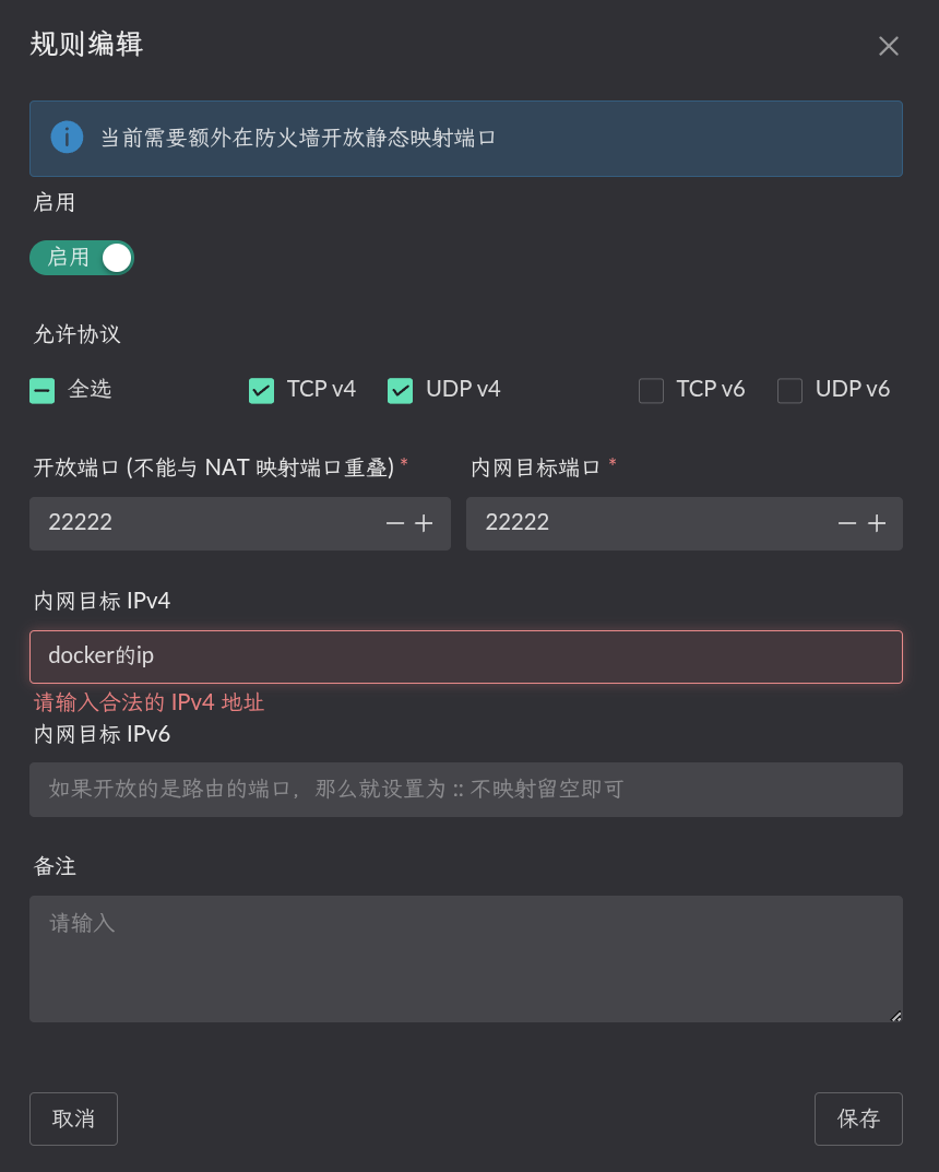 静态NAT配置 (内网目标端口为容器对应wg的端口, IP 为容器 IP)