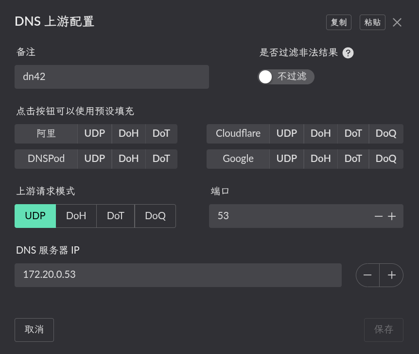 在dns相关的上游dns配置管理里,点击创建添加dn42网络段的dns