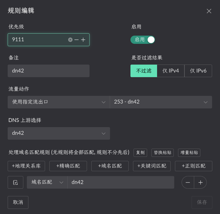 此时再回到分流设置, 在Flow 11的DNS里增加规则