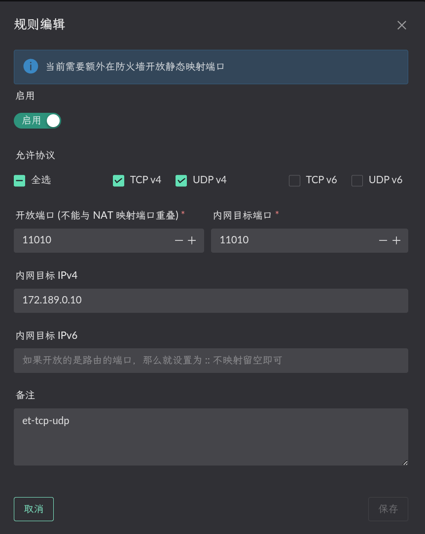 静态NAT配置 (内网目标端口为容器端口, IP 为容器 IP)