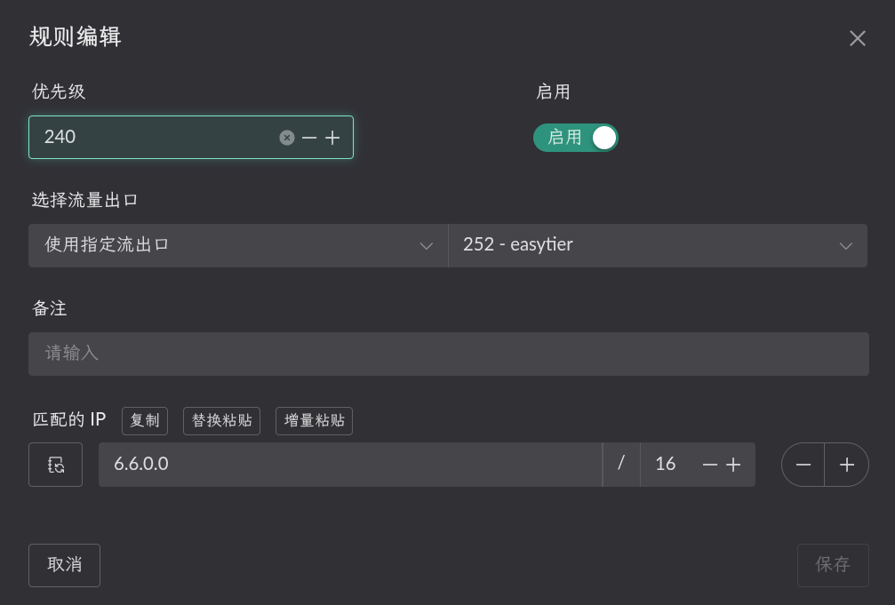 这样, 当 LAN 客户端访问 6.6.0.0/16 时, 这些数据包就会使用 Flow 252 (easytier) 的出口, 也就是被转发到 easytier 容器中.