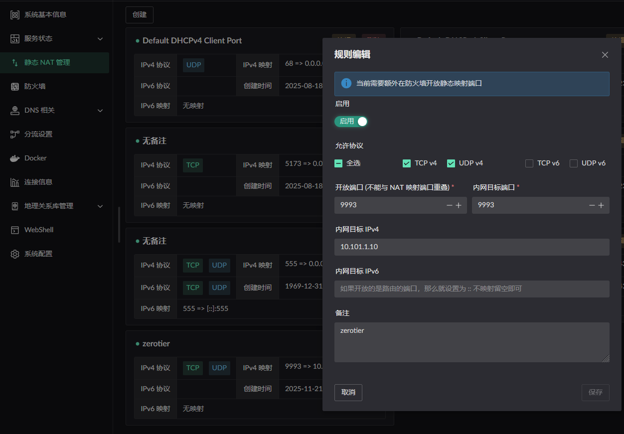 9993), 配置静态 NAT. - 将 ZeroTier 使用的