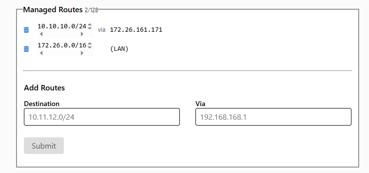 valid_lft forever preferred_lft forever将你的 内网 (我这是 10.10.10.0/24) 配置到 zerotier 中, via 字段填的是 上方查询到的 容器内的 IP (172.26.161.171)